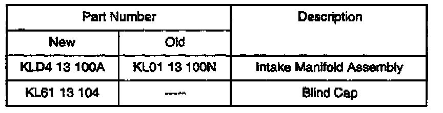 ^ Interchangeability - The modified intake manifold may be installed on 1994-95 626/MX-6 model vehicles produced prior to Engine No. KL 584698. However, a blind cap must also be installed over the vacuum pipe on the manifold. Refer to the illustration.