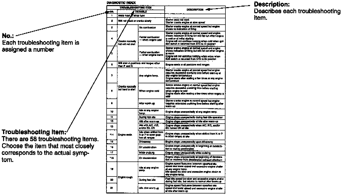 USING THIS SECTIONMost of the automatic transaxle control system is electronically controlled, often making it difficult to diagnose problems in the system, especially intermittent problems. Before undertaking actual checks, take a few minutes to talk with a customer who approaches with a driveability complaint. The customer is often a good source of information on such problems, especially intermittent ones. Through talks with the customer, one can find out what the symptoms are and under what conditions they occur.