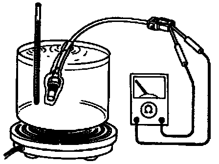 2. Place the transaxle fluid temperature sensor in ATF with a thermometer as shown and heat the ATF gradually.