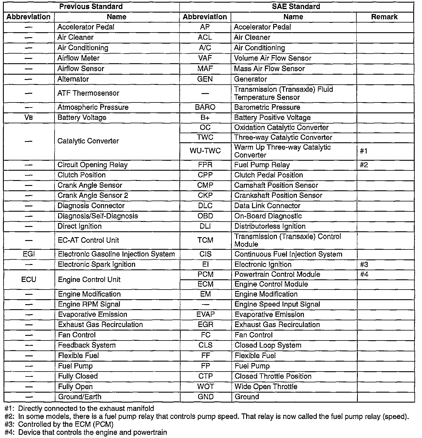 In accordance with new regulations SAE (Society of Automotive Engineers) standard names and abbreviations are now used. The table above lists the names and abbreviations that have been used by Mazda up to now and their SAE equivalents.