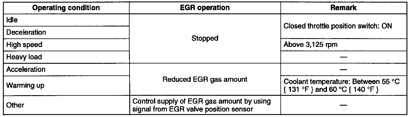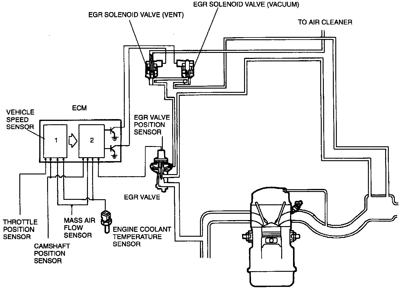 This system recirculates a small amount of exhaust gas into the intake manifold to reduce the combustion temperature, and reduce the NOx emissions. This system consists of the EGR valve, EGR valve position sensor, two solenoid valves, engine control module (ECM) and input devices.