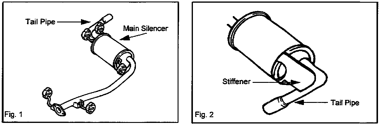 The tail pipe may be broken at the weld by exhaust gas resonance. To improve the strength, a stiffener has been added to the location as shown. Customers complaining of this concern should have the main silencer replaced with a modified one.