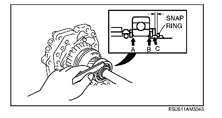 6. With points A through C pressed tightly together, measure the clearance between the washer and snap ring. If the clearance is not as specified, select the proper C-washers.