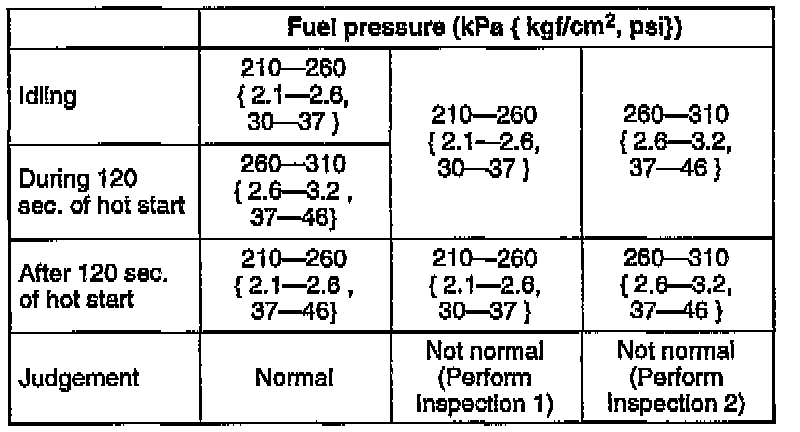 3. If the fuel pressure is not within the specification, carry out either Inspection 1 or Inspection 2 as required.