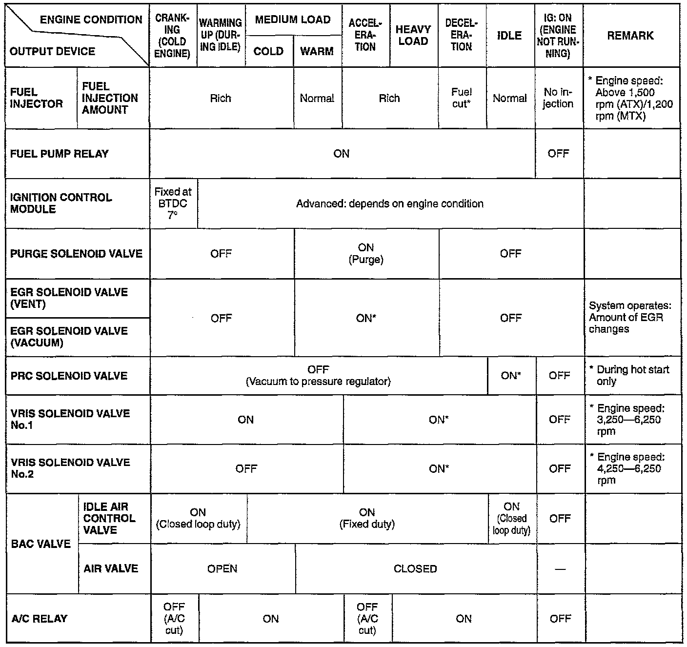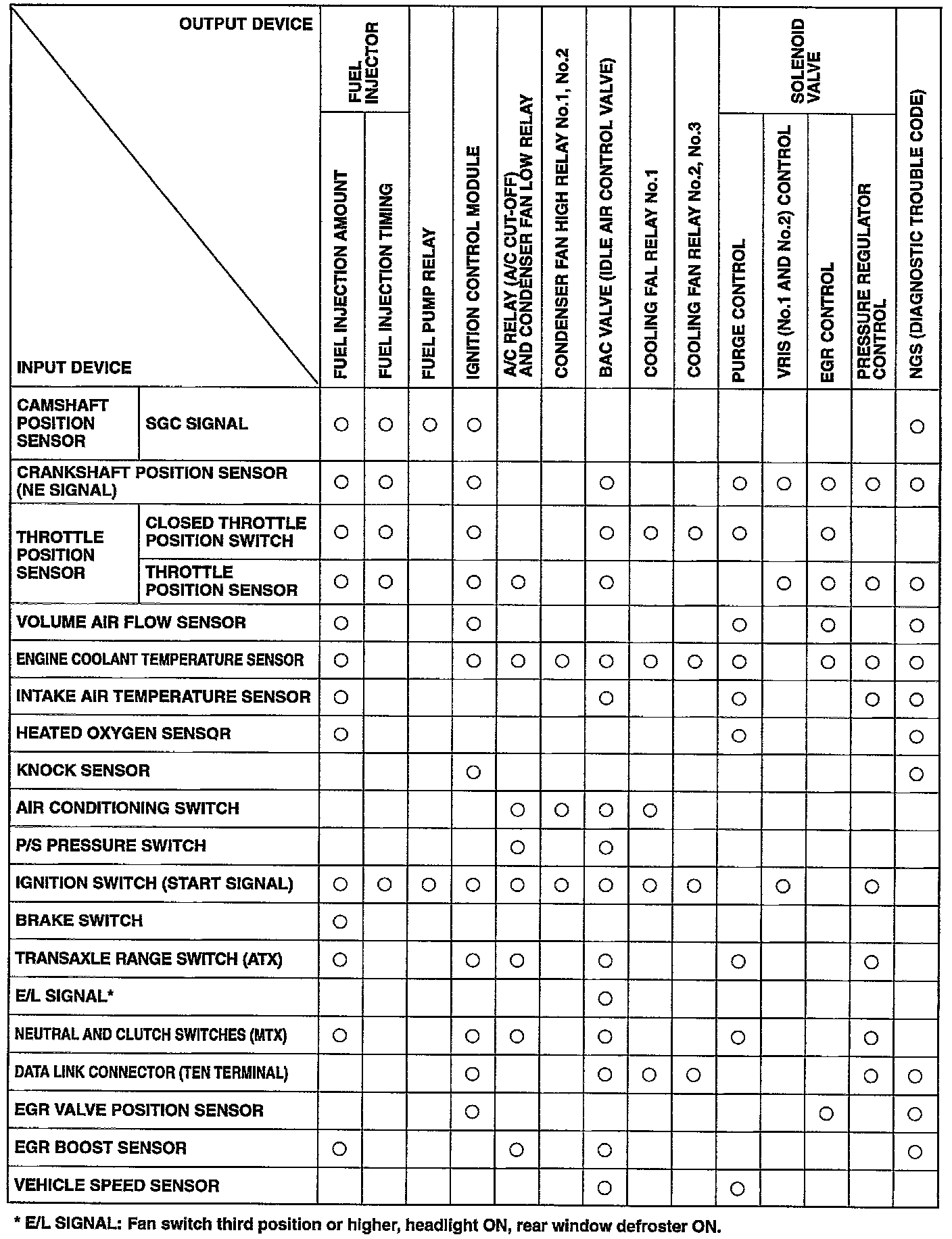 OUTPUT DEVICES AND ENGINE CONDITION RELATIONSHIP CHART