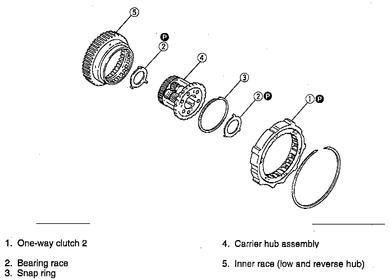 6. Install the thrust bearing to the sun gear drum side of the one-way clutch and carrier hub assembly. Bearing race outer diameter for the sun gear drum side is 72.0 mm (2.83 inch) and the 3-4 clutch side is 57.0 mm (2.24 inch).