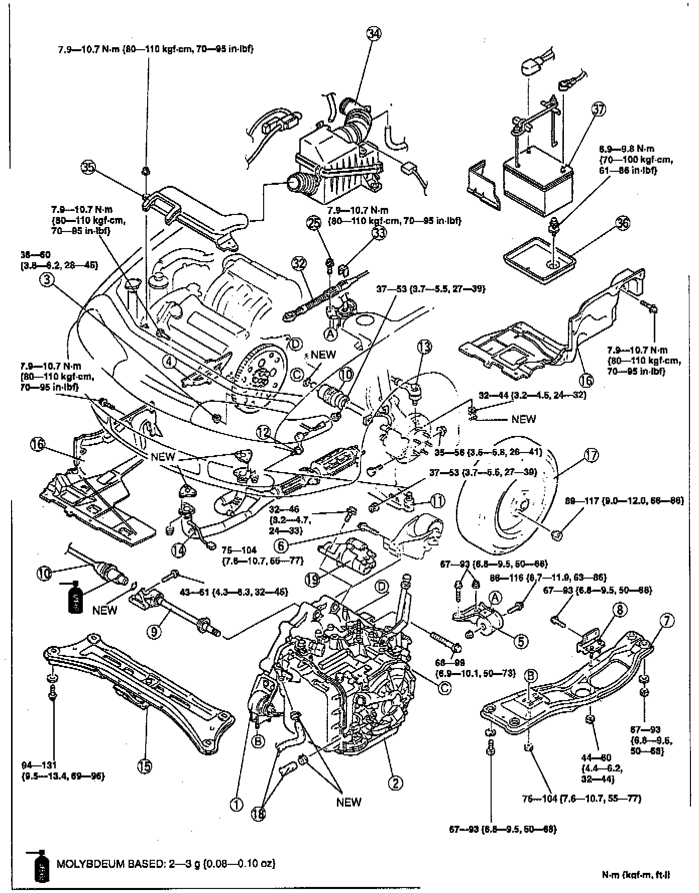 2. Install the transaxle mounting bolts and tighten to 68 - 99 Nm (50 - 73 ft. lbs.).
