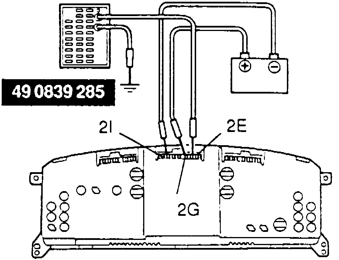 1. Remove instrument cluster as described in appropriate chassis section, then connect B+ to instrument cluster terminal 2G and ground to terminal 2I, Fig. 20.2. Connect special tool positive lead to instrument cluster terminal 2E, Fig. 20, and negative lead to ground.