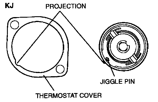 Install the thermostat into the thermostat cover with the jiggle pin and projection aligned.