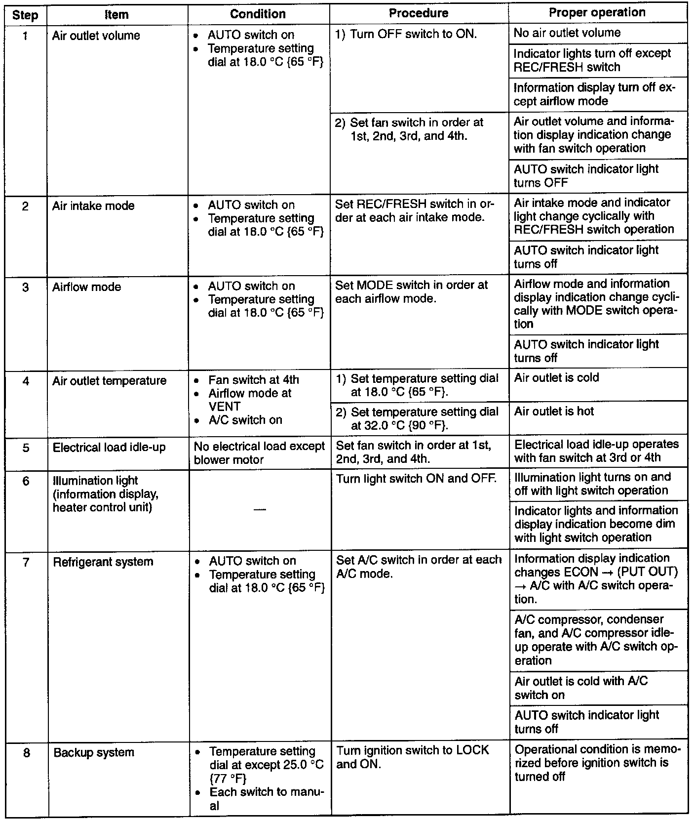 AFTER SERVICE OPERATION CHECKVerify that each control operates as described below after repairing the air conditioning system. Start and warm up the engine (so that the engine coolant temperature reaches 40 - 100 °C {104 - 212 °F}).