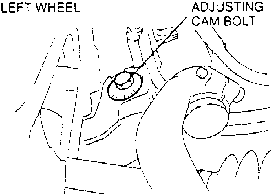 1. Loosen cam nut on upper lateral link.2. Turn adjusting cam bolt, Fig. 1, to provide camber angle, Fig. 2. Turning adjusting cam bolt one graduation changes camber about 8/30°.