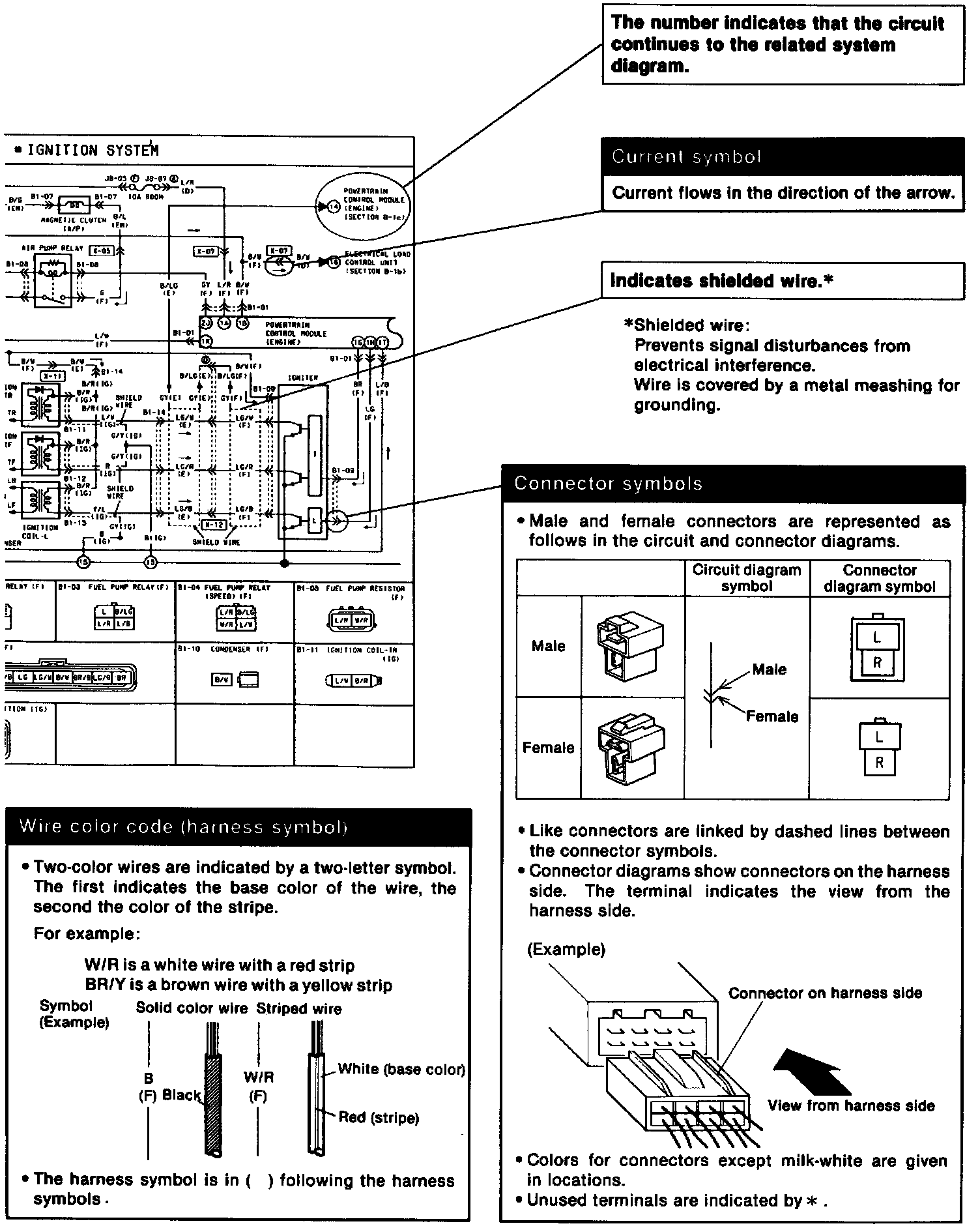 ^ These show the circuits for each system, from the power supply to the ground. The power supply side is on the upper part of the image, the ground side on the lower part. The diagrams describe circuits with the ignition switch off.