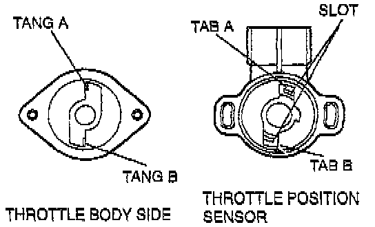 5. Open the throttle valve slightly and catch the tang of the throttle body on the throttle position sensor plastic tabs. Align tang A on the throttle body with tab A on throttle position sensor. Note tangs on the throttle body mate with the tab on the throttle position sensor on the side of the tab without a slot.