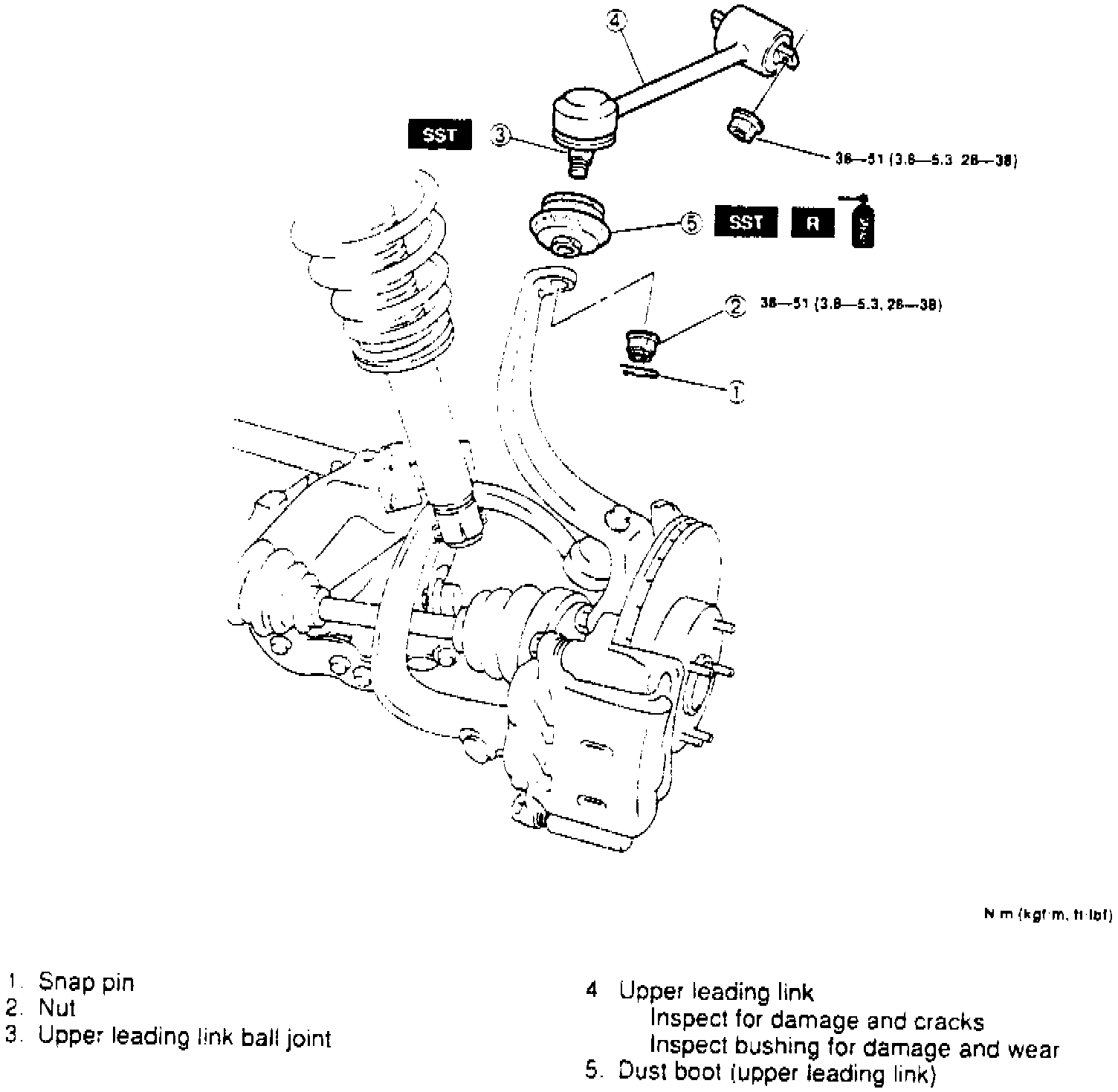 3. Remove upper leading link and inspect for damage and cracks. Inspect bushing for damage and wear.