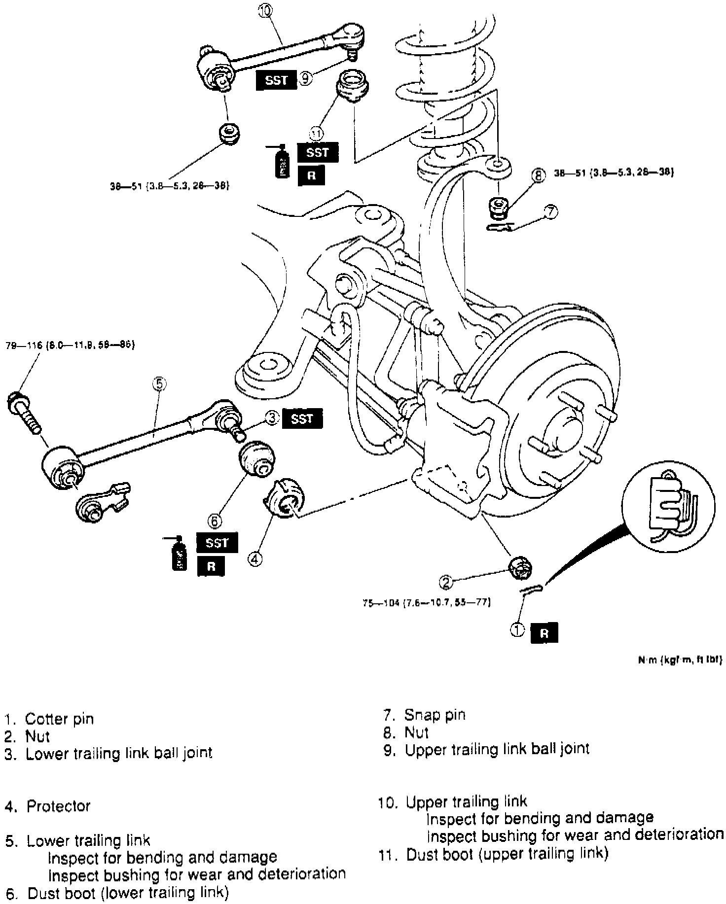 7. Remove upper trailing rod and inspect for bending and damage. Inspect bushing for wear and deterioration.
