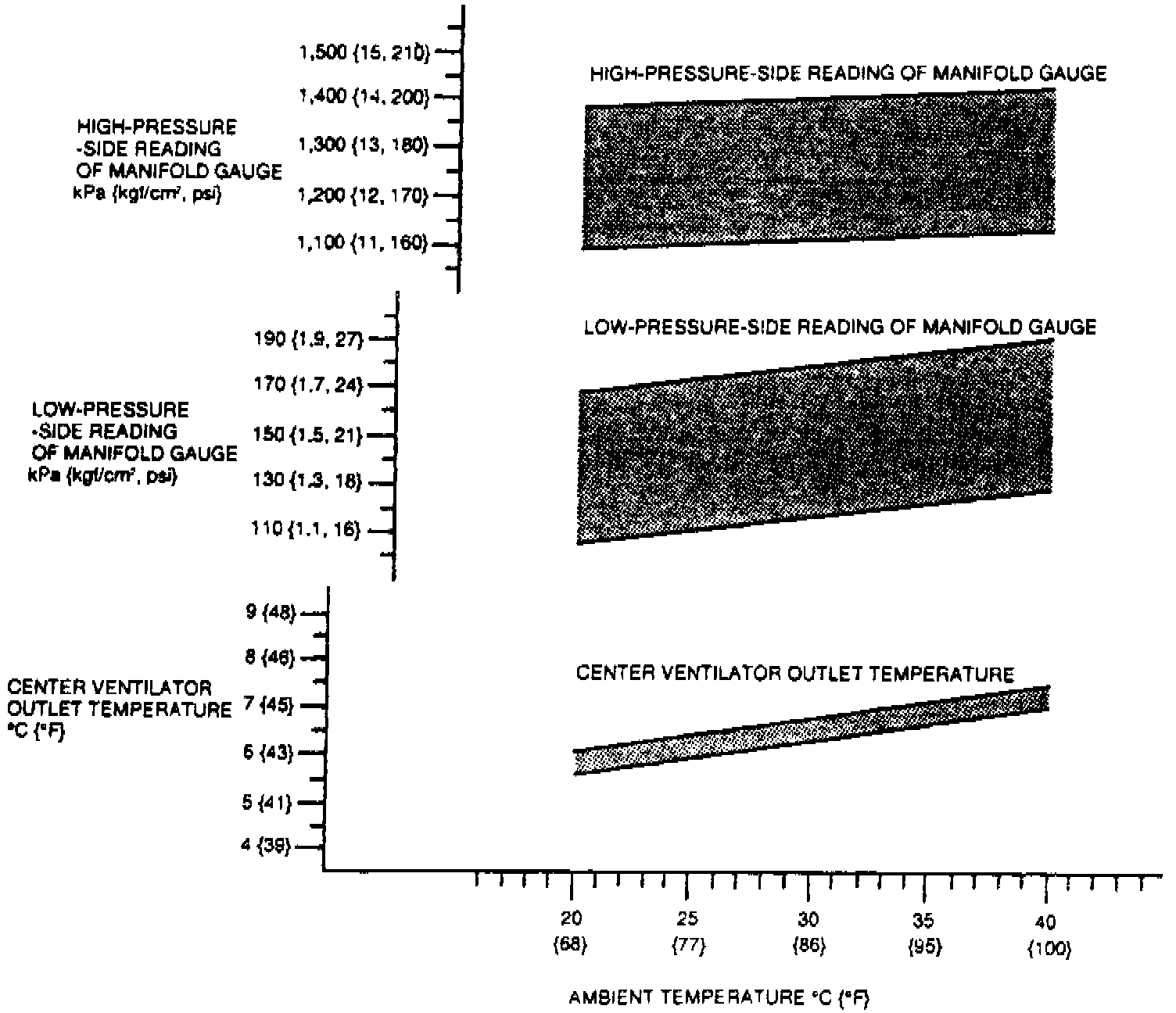 7. Operate A/C system until output temperature stabilizes. Ensure reading on pressure gauge is as follows: