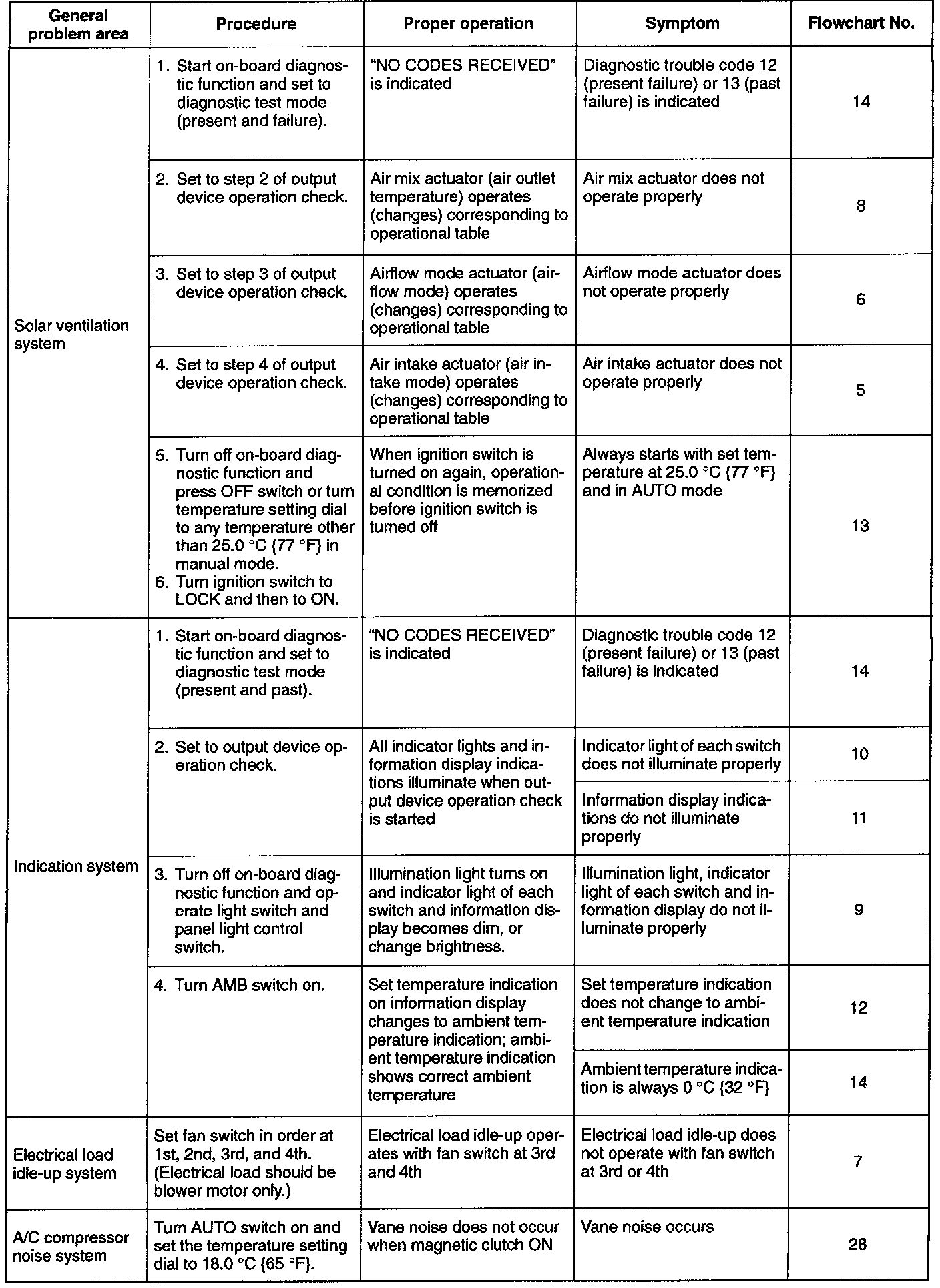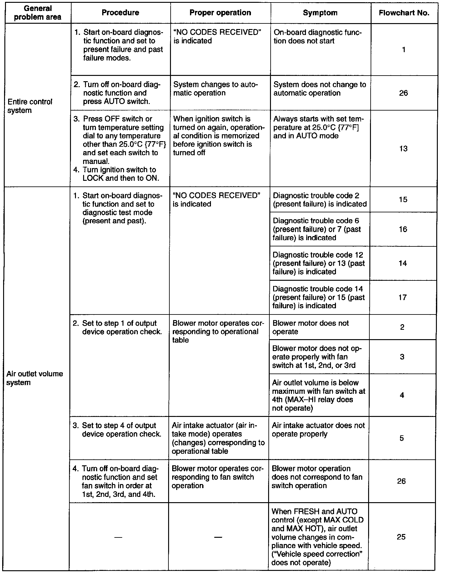 If the system does not operate properly (third column), determine the symptoms and corresponding flow-chart number (fourth and fifth columns). Refer to the appropriate flowchart and troubleshoot the system.