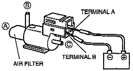 4. Apply battery positive voltage to terminal A and ground terminal B of the solenoid valve. Verify that air flows as shown below.