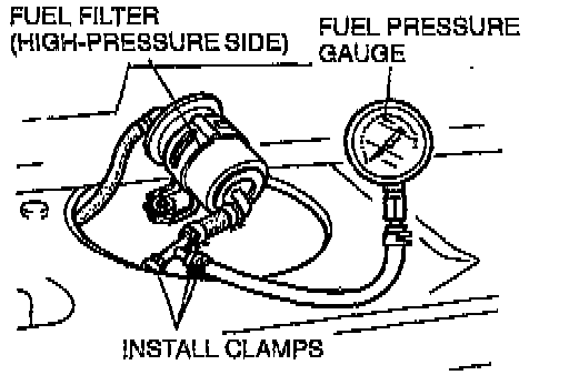 2. Connect a fuel pressure gauge between the fuel filter (high-pressure side) and the fuel distributor. Install clamps as shown in the figure.