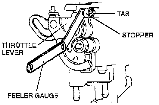 5. Insert a 0.50 mm (0.020 in) feeler gauge between the throttle adjusting screw (TAS) and the throttle lever. Verify that there is no continuity.