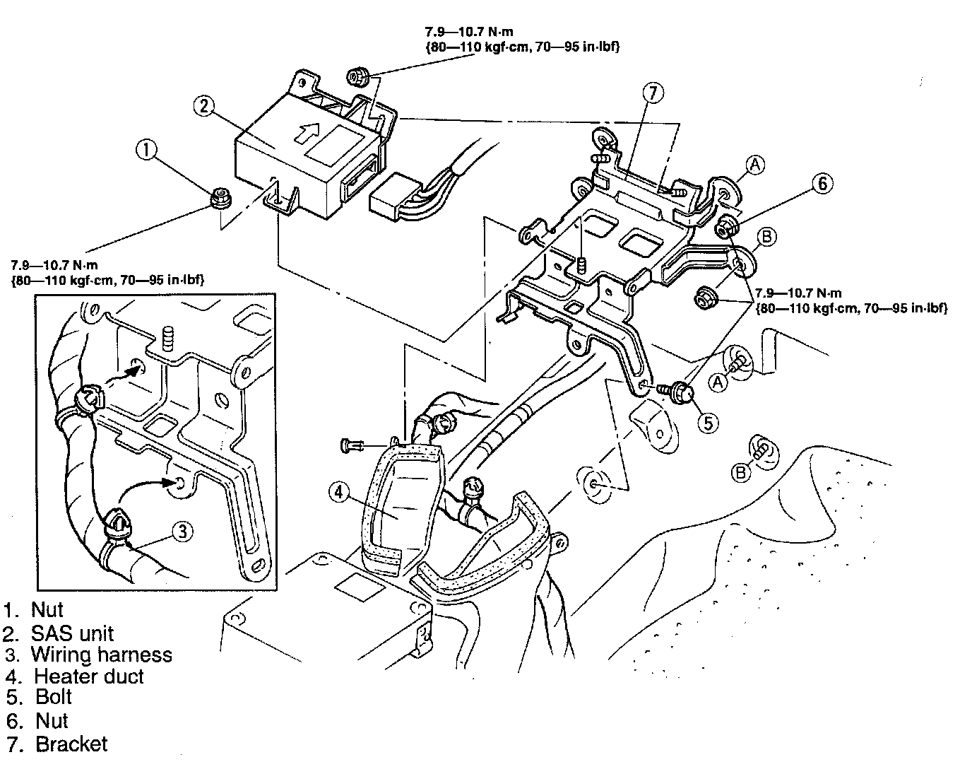 2. Position the SAS unit and bracket with the arrow on the SAS unit facing toward the front of vehicle. Install them and tighten the bolts and nuts to the specified torque.
