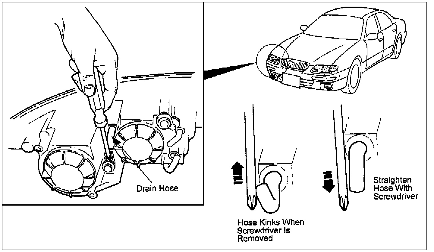 After adjusting the headlight aim, confirm that the drain tube is not kinked. These tubes are located around the headlight adjustment screws and may become kinked when the screwdriver is removed.