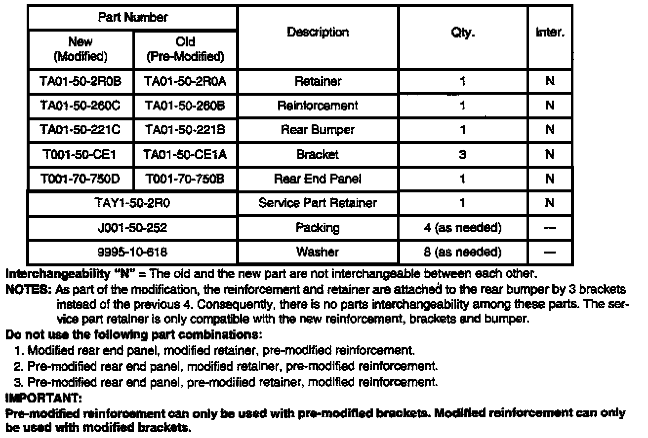 The installation method for the rear bumper has changed. The instructions in this bulletin should be used to determine the appropriate installation when matching old and modified parts.