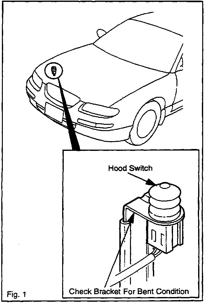 ^ If the hood switch bracket is bent down, the switch-to-hood clearance may be too large, causing intermittent activation or a failure to arm.