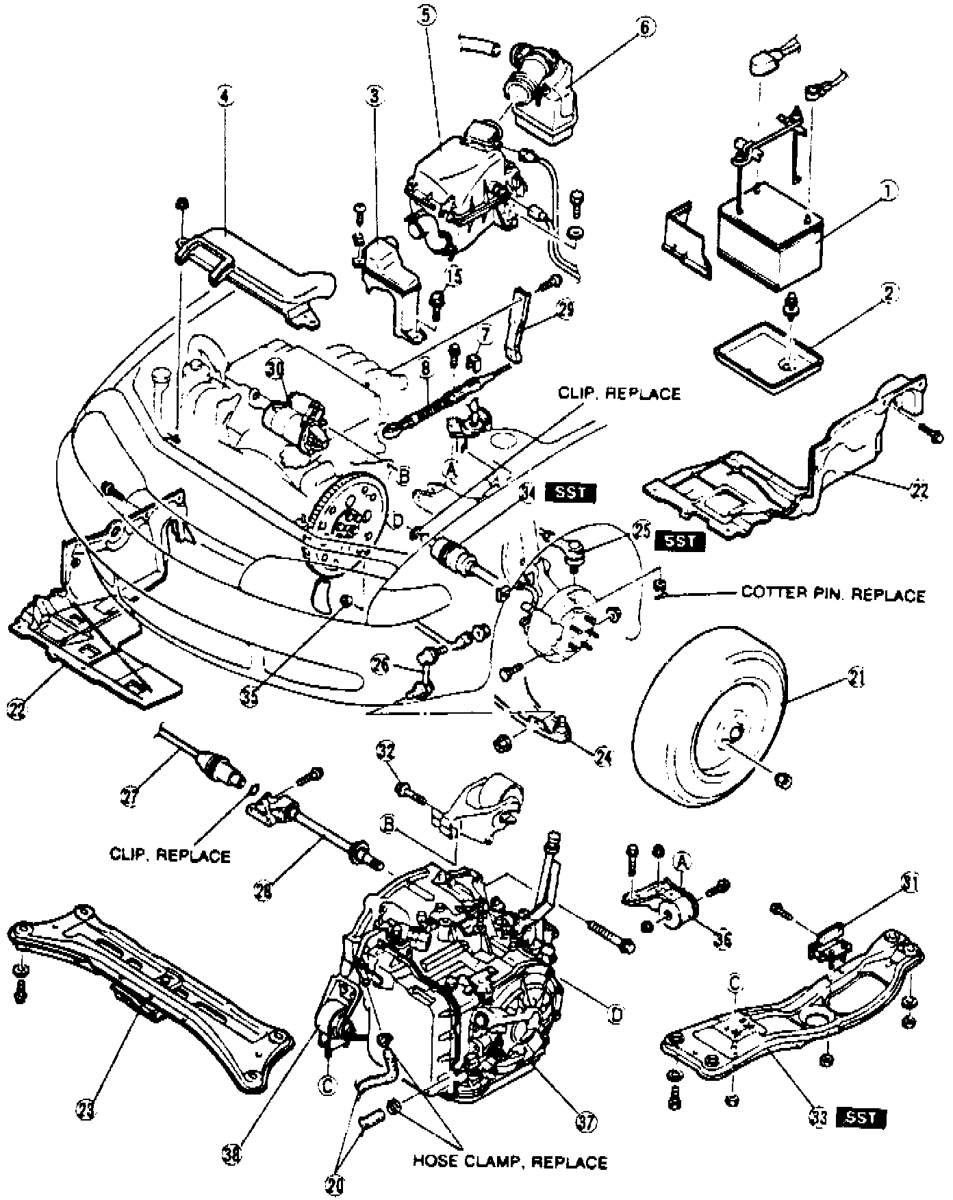 a. On 1993 models equipped with 2.0L engine, transaxle bolts, Fig. 19, A, 40 - 73 ft.lb.; B, 28 - 38 ft.lb.; C, 14 - 18 ft.lb.
