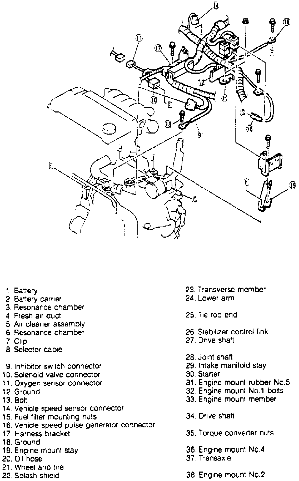 22. Remove engine mount No. 4, then loosen engine support and lean engine toward transaxle.