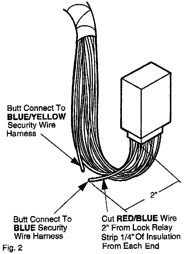 ^ Cut the RED/BLUE wire 2" away from the door lock relay 8-pin connector. Refer to Fig. 2