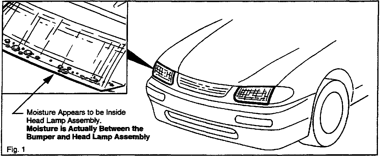 Water may settle in the area between the head lamp assembly and the bumper. This water may appear to customers as moisture inside the head lamp. Service managers and advisors should explain to customers that the water is actually located on the bumper and is not inside the head lamp assembly.