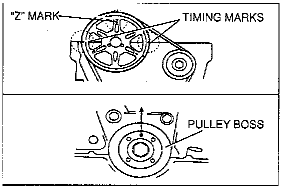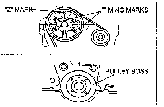 - Timing is correct when the locating pin on the pulley boss and "Z" mark on the camshaft pulley are facing straight up, and the timing marks are aligned with the cylinder head upper surface.
