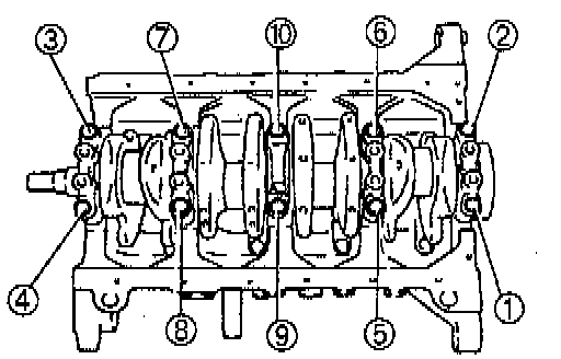 Tighten the main bearing cap bolts in two or three steps in the order shown.