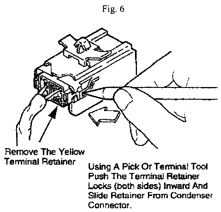 6. Disengage the yellow terminal retainer from the condenser connector. Slide the yellow retainer approximately 1/4 inch from condenser connector.