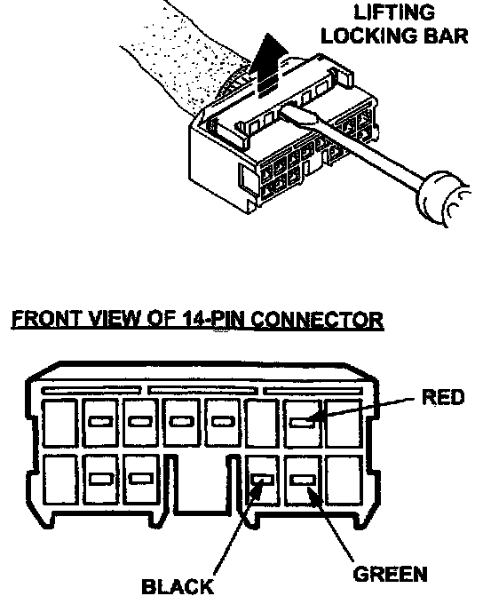 B. Remove the black, green, and red wire terminals from the connector by lifting the tab with a suitable tool and slide out terminals. Refer to illustration.