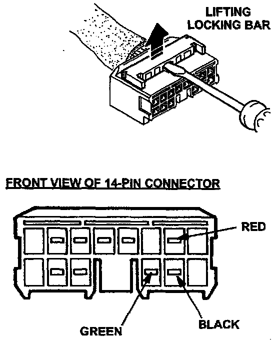 B. Remove the black, green, and red wire terminals from the connector by lifting the tab with a suitable tool and slide out terminals. Refer to illustration.