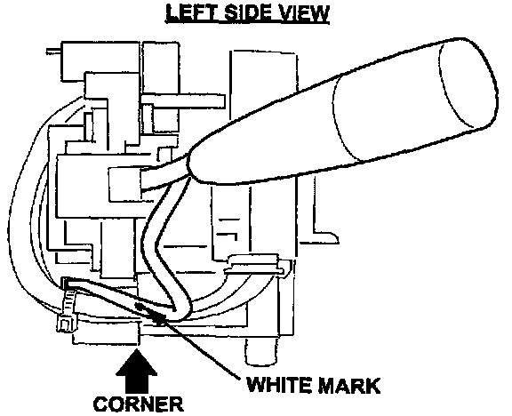 15. At the left side of the combination switch assembly, align the white mark on headlight switch harness with the comer of combination switch as shown.