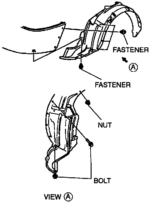 NOTE: Before removing the fresh-air duct, remove the LH front mud guard mounting bolts, nut, and fasteners shown.