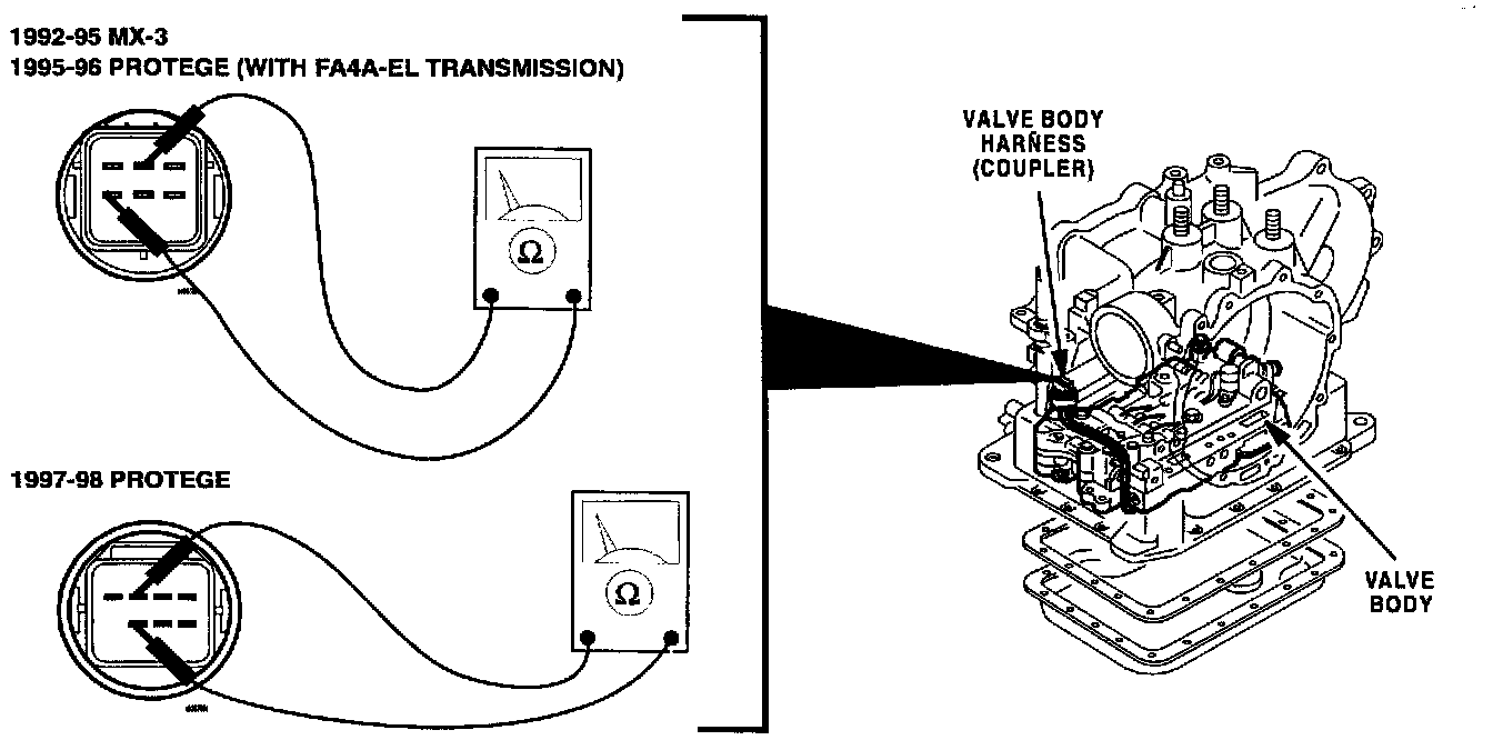 ^ If there is no continuity, or sensor resistance is out of specification, replace the valve body harness (coupler) with modified part. Proceed to STEP 7.