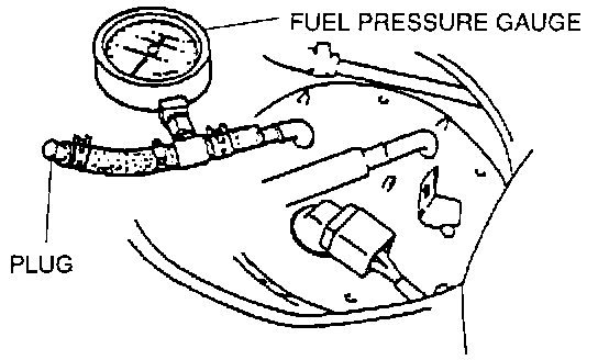 2. Connect a fuel pressure gauge to the fuel pump and plug the outlet of the gauge as shown. (Install clamps as shown.)