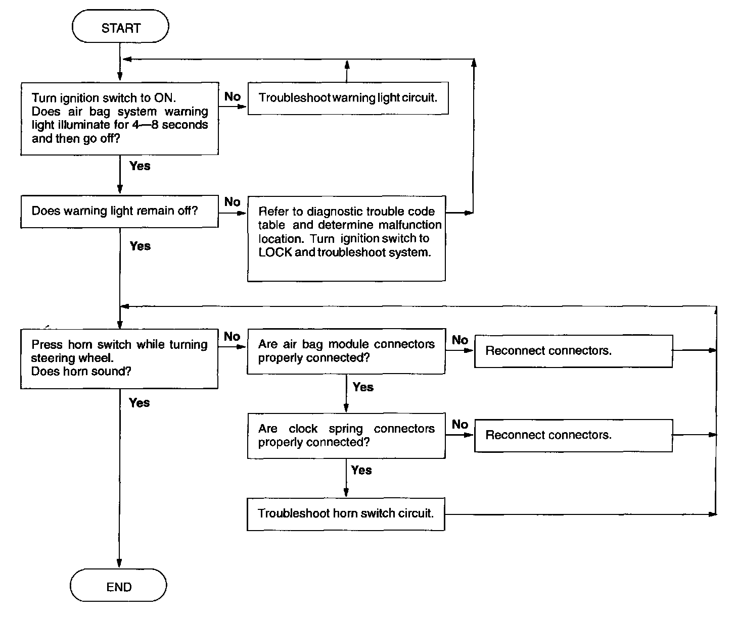 The SAS unit has an on-board diagnosis function that flashes or illuminates the air bag system warning light to indicate trouble in the air bag system. The trouble can be determined by the warning light illumination or flashing pattern. If the light does not illuminate but the system still has trouble, a warning buzzer will sound 5 cycles of 5 times each.