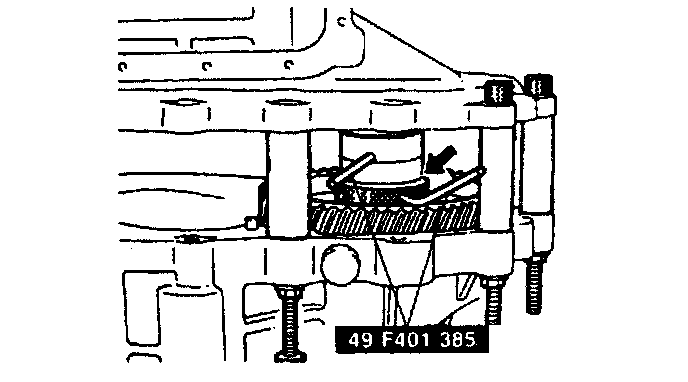 8. Turn the SST (selector) to increase the clearance (arrow) by using the SST (bars), until it no longer turns. This is to seat the bearing race.