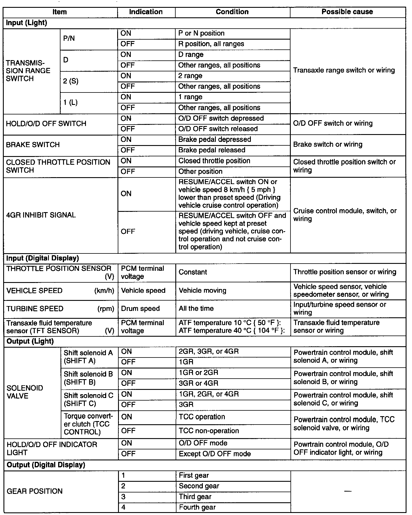 4. Check the indication of the respective light or digital display in each condition, referring to the indication table.