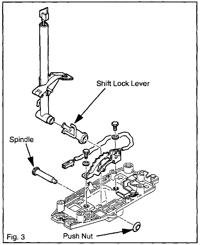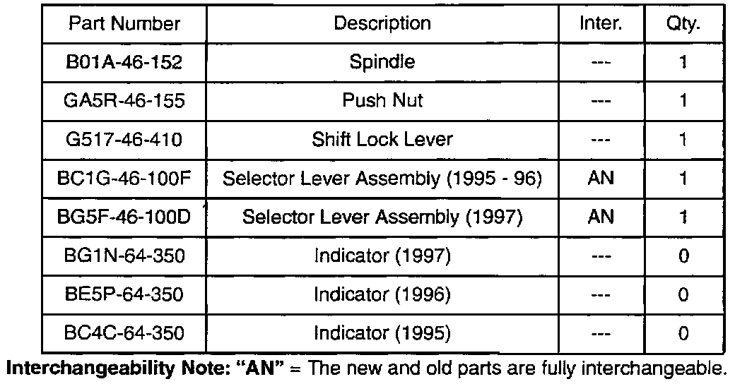 The shift lever movement may be stiff when moving through all gear ranges. This concern is due to liquid residue on the shift indicator panel or rust accumulation on the shift lever pivot. To reduce this concern, the shift lock lever and spindle have been nickel plated and the amount of grease applied to the serrated area of the spindle increased.