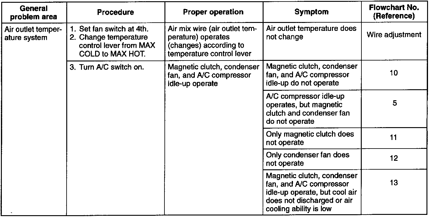 TROUBLESHOOTING CHECKLISTSDetermine symptoms of the problem based on the customer's complaints. Refer to the fuse checklist and match the symptoms obtained from the customer with those listed in the table. Check the appropriate fuse. If the fuse is OK, operate the system. Determine the general area of the problem; for example, airflow, idle-up, or temperature.