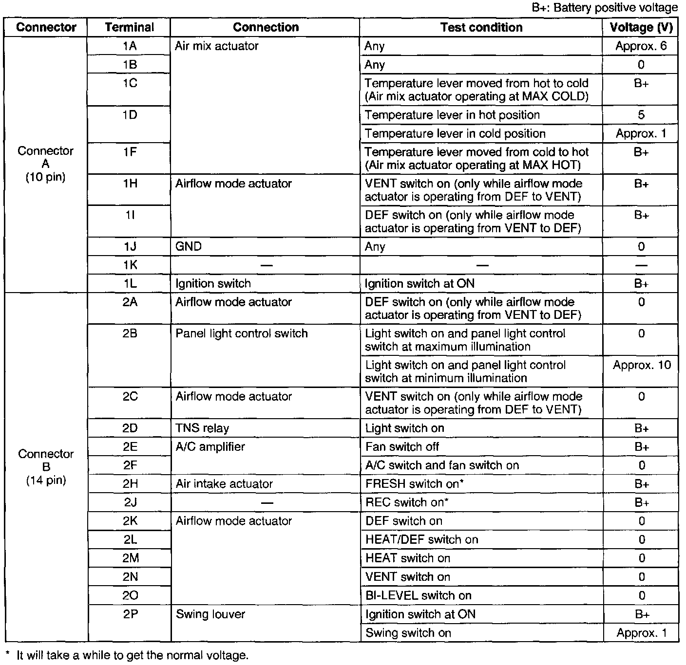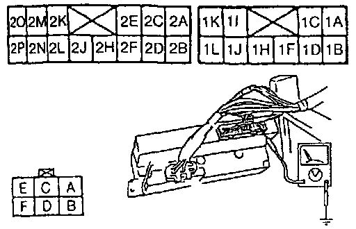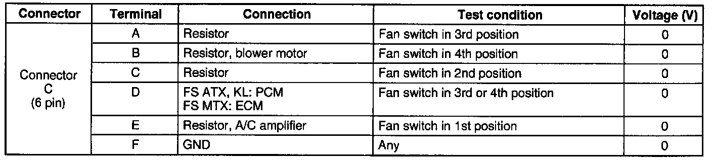 2. Measure the voltage at each terminal of the heater control unit connectors and fan switch connector.