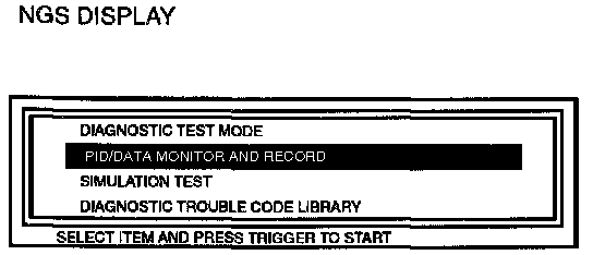 2. Referring to the New Generation Star (NGS) tester instruction manual, select the "PID/DATA MONITOR AND RECORD" and press TRIGGER.