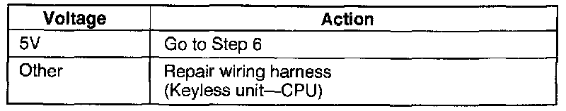 Measure the voltage at terminal E (R/Y) wires of the keyless unit connectors.