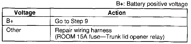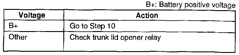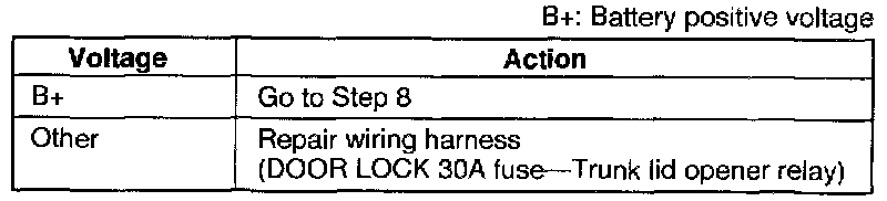 Measure the voltage at the (LG/R), (G/W) terminal wire of the trunk lid opener relay connector, with the transmitter by pressing the TRUNK button.